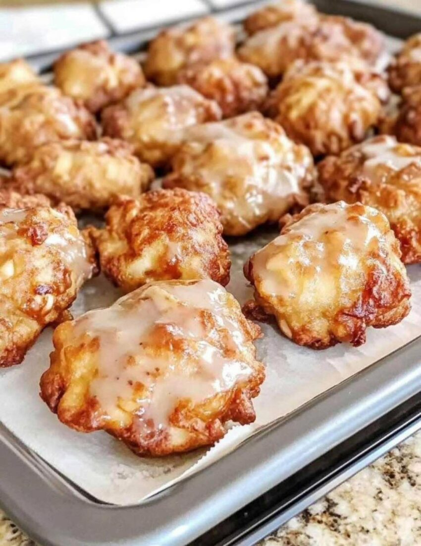 - While fritters cool slightly, mix powdered sugar, milk, and vanilla to make a glaze.