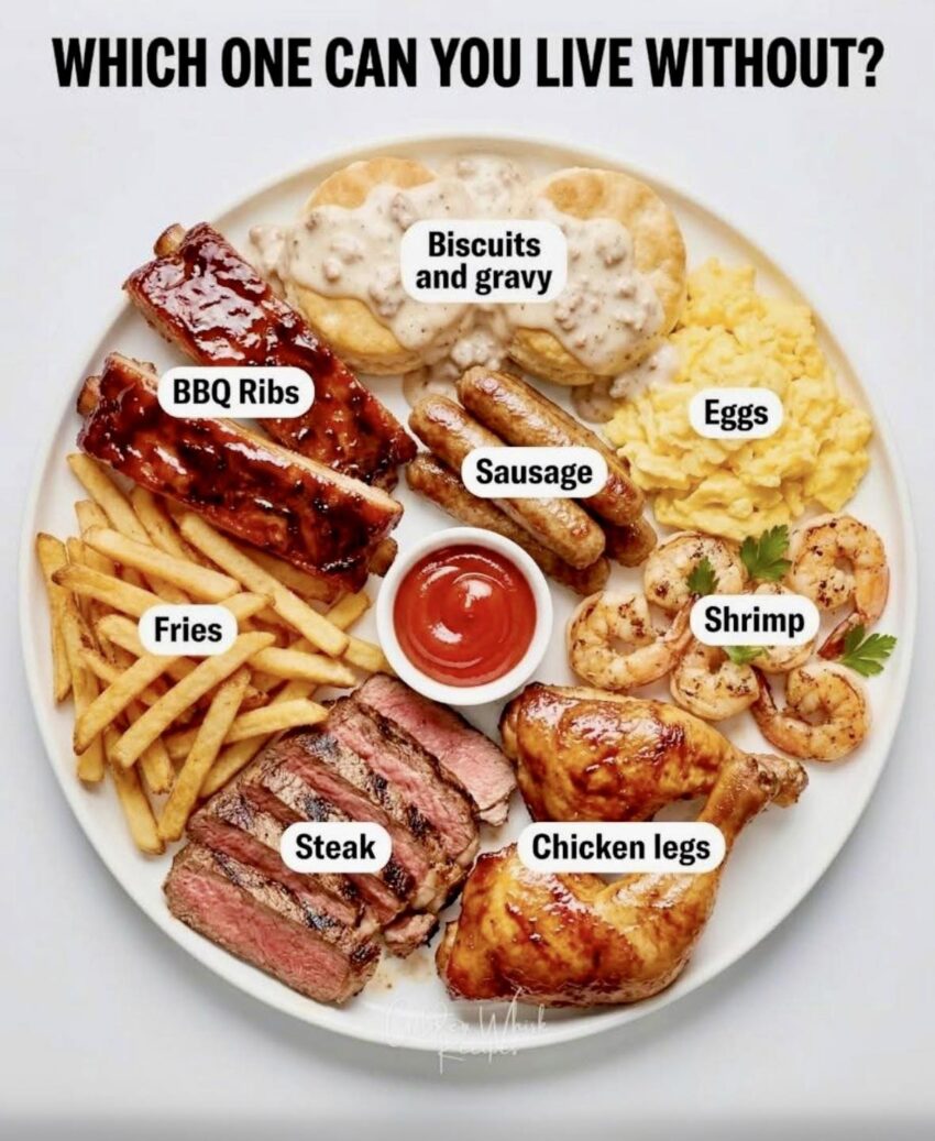 BBQ Ribs, Biscuits and Gravy, Chicken Legs, Eggs, Sausage, Fries, Shrimp, Steak