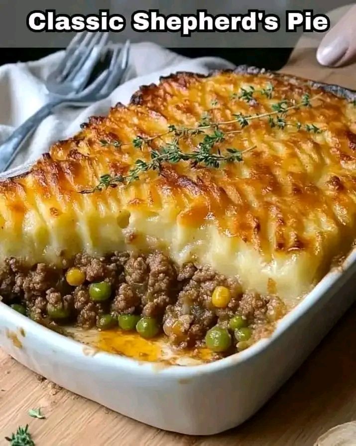 Here’s a hearty Classic Shepherd’s Pie 🥧 — savory ground meat, veggies, and a creamy mashed potato topping.
