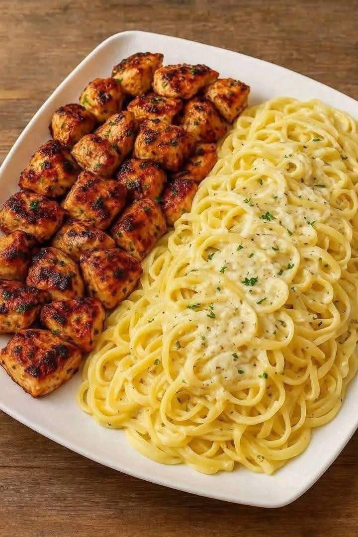 Here’s a simple, creamy garlic butter chicken & linguine in Alfredo sauce 🍝🧄