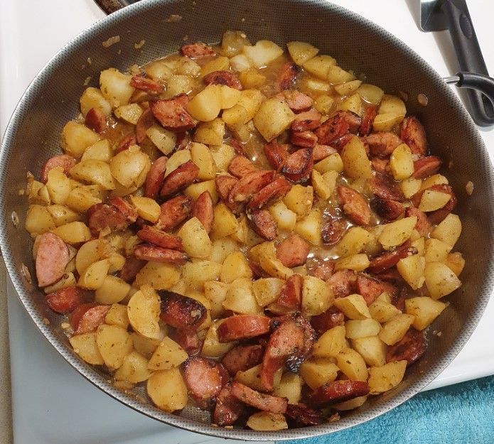 - Stir the kielbasa and potatoes together and cook for another 2-3 minutes.