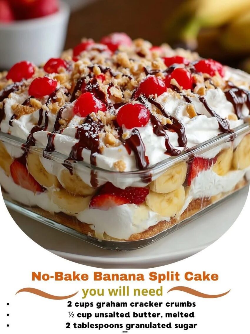 Ohhh yes 🍌🍫🍓 No-Bake Banana Split Cake—a creamy, dreamy dessert that tastes just like a banana split but in cake form. Perfect for summer or any time you want an easy, indulgent treat.