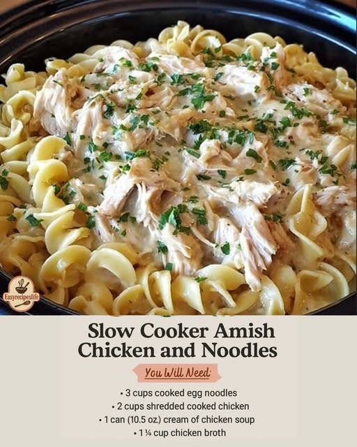 Ohhh yes 😍 Slow Cooker Amish Chicken and Noodlesβ€”pure comfort food. Thick, tender noodles, juicy chicken, and a rich, home-style broth that feels like a warm hug. Super easy and perfect for busy days.