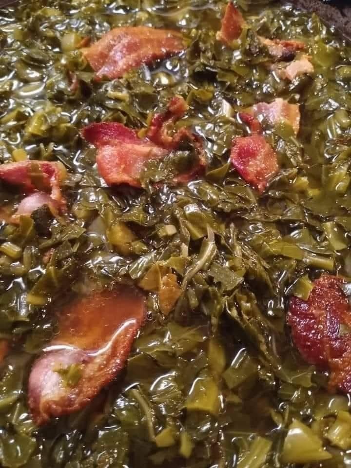 Southern collard greens are a popular dish in Southern U.S. cuisine, known for their hearty and flavorful greens. They’re typically cooked with smoked meat (like ham hocks, bacon, or turkey) and seasoned with things like garlic, onion, and vinegar to give them that signature deep, savory flavor. Collard greens are often served as a side dish with cornbread, fried chicken, or other Southern staples.